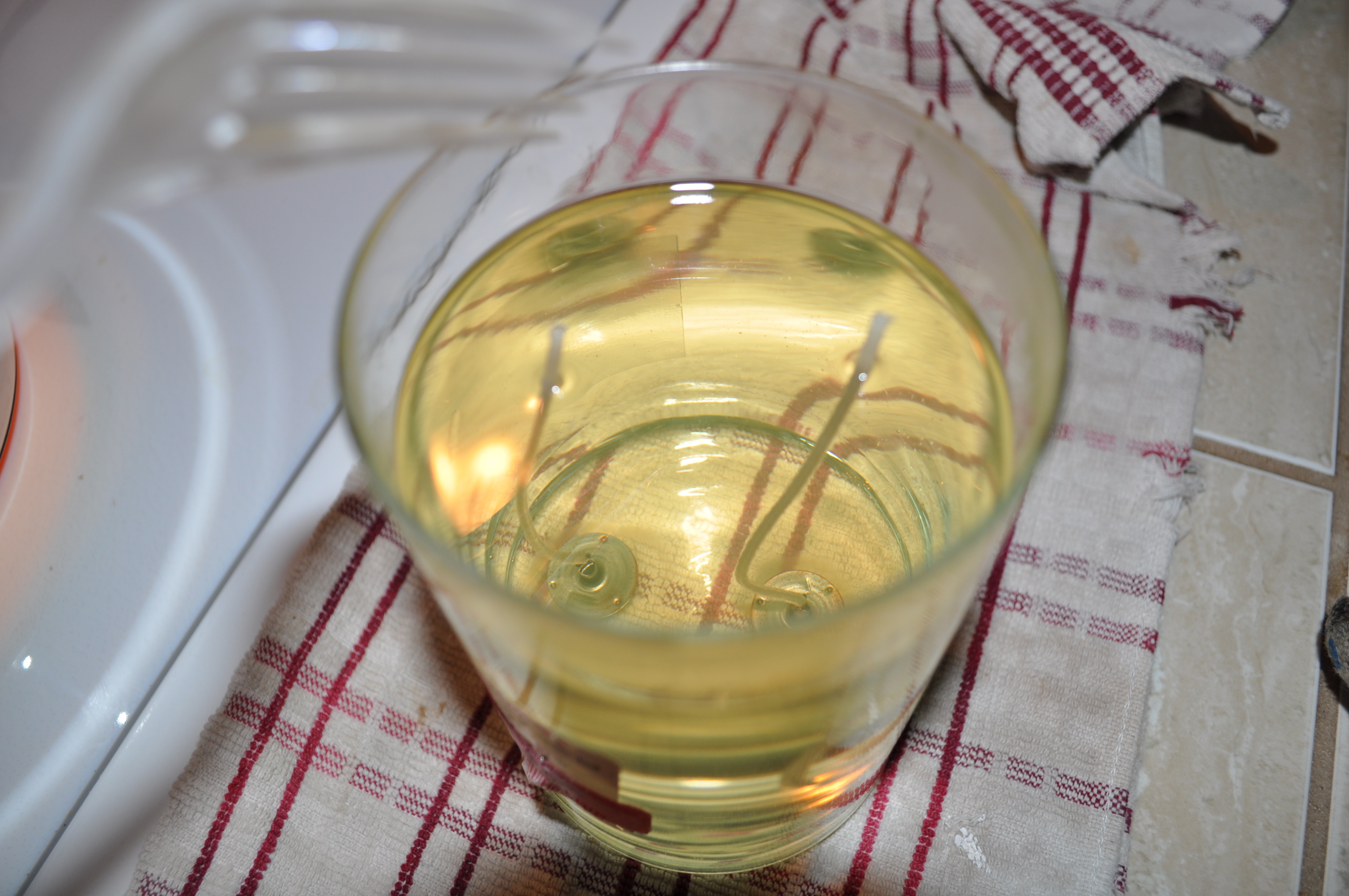 I went home, got my pot of boiling water going and had my supplies ready. Now it didn’t even occur to me that the wick wouldn’t need to be replaced. I don’t know why – I guess I just thought I could replace it anyway. After melting the wax the candle had two wicks.